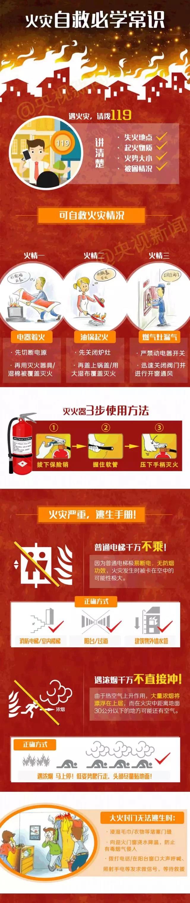 最後(hòu),給大家普及下火災自救必學(xué)常識: